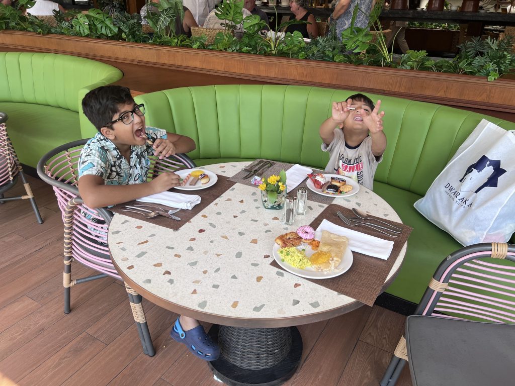 Early in the morning, we seized the quiet moments before the kids awoke. Hand in hand, we strolled along the beach, took in the breathtaking view near the infinity pool, and captured the tranquillity in photos. The morning continued with my favourite activity – an invigorating yoga session in the open garden right before the sea. The cool air, yoga stretches, and meditation created a serene start to the day.