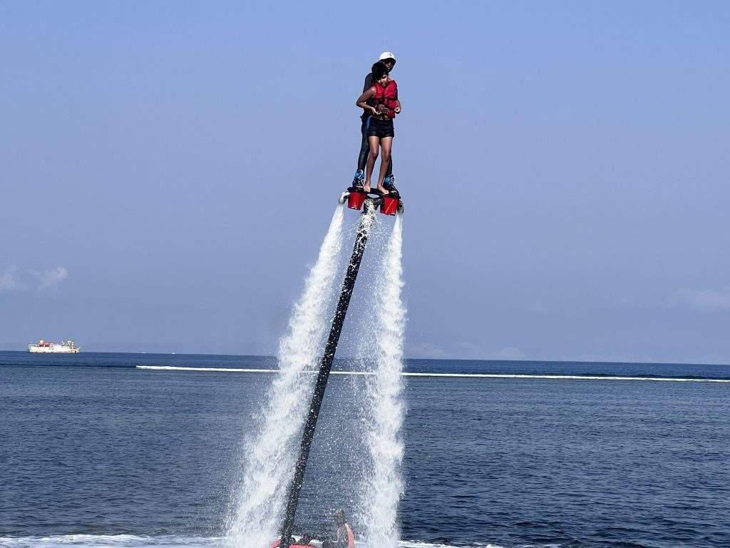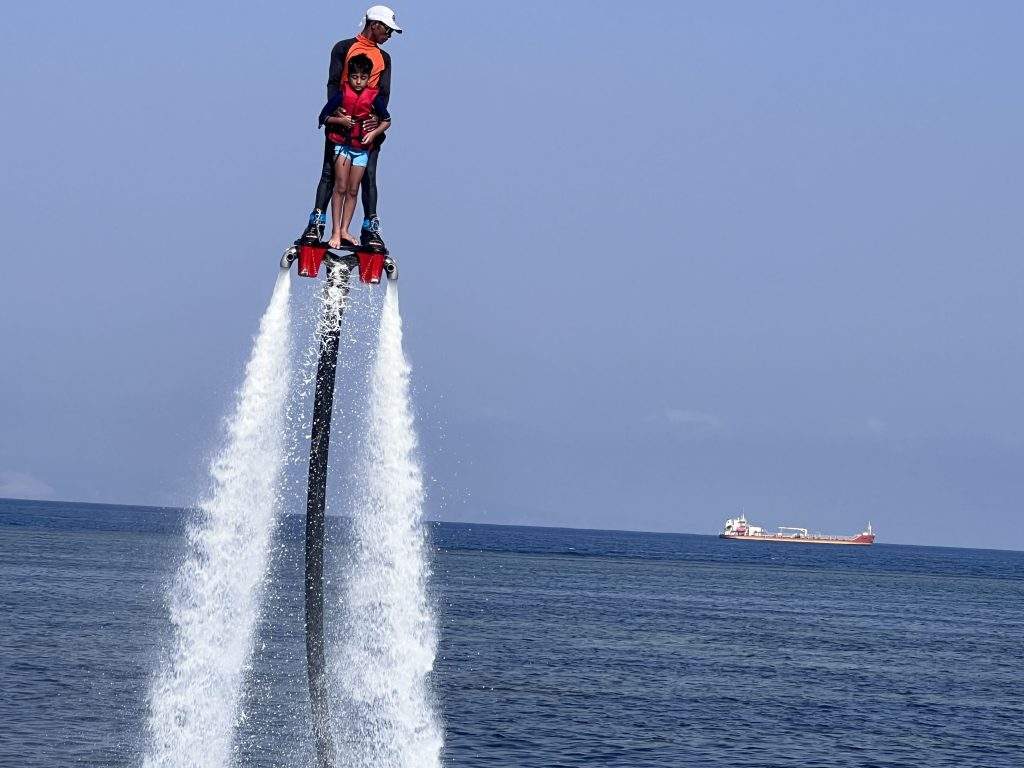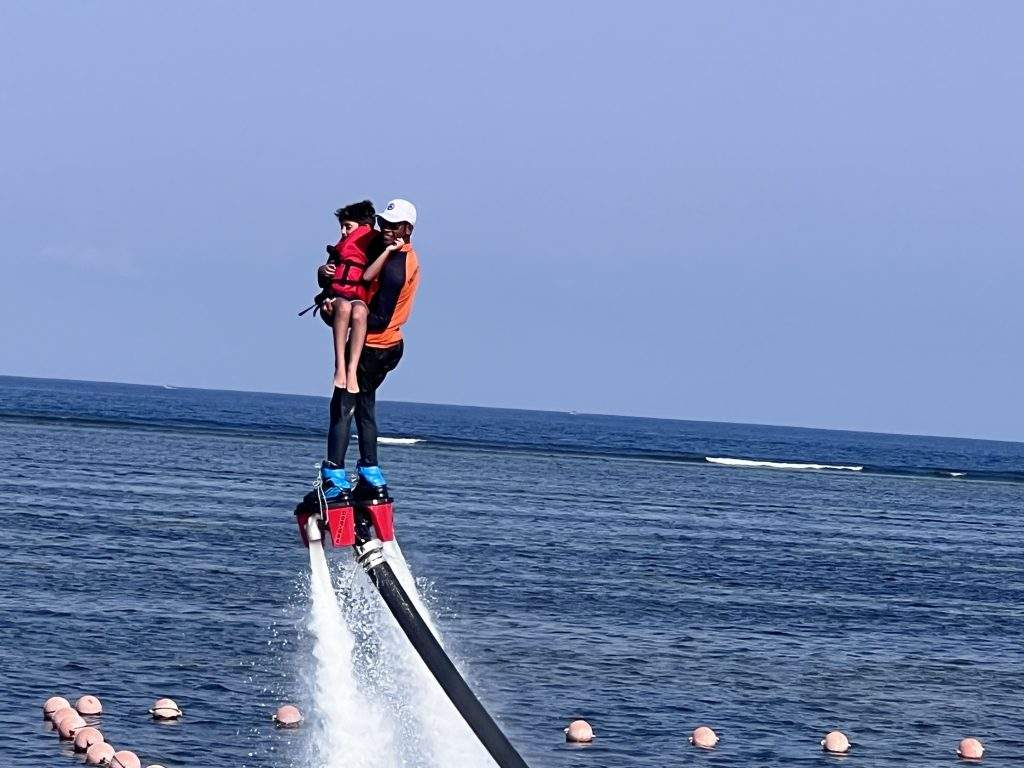The excitement reached new heights with a series of water activities. We embarked on kayaking, took a glass bottom boat ride to the tortoise park, and marvelled at the variety of tortoises while feeding them. Parasailing provided mesmerizing views from high above, FlyBoard was like flying in air through water pressure below and the underwater sea walk offered an immersive experience, walking undersea and interacting with the vibrant marine life.