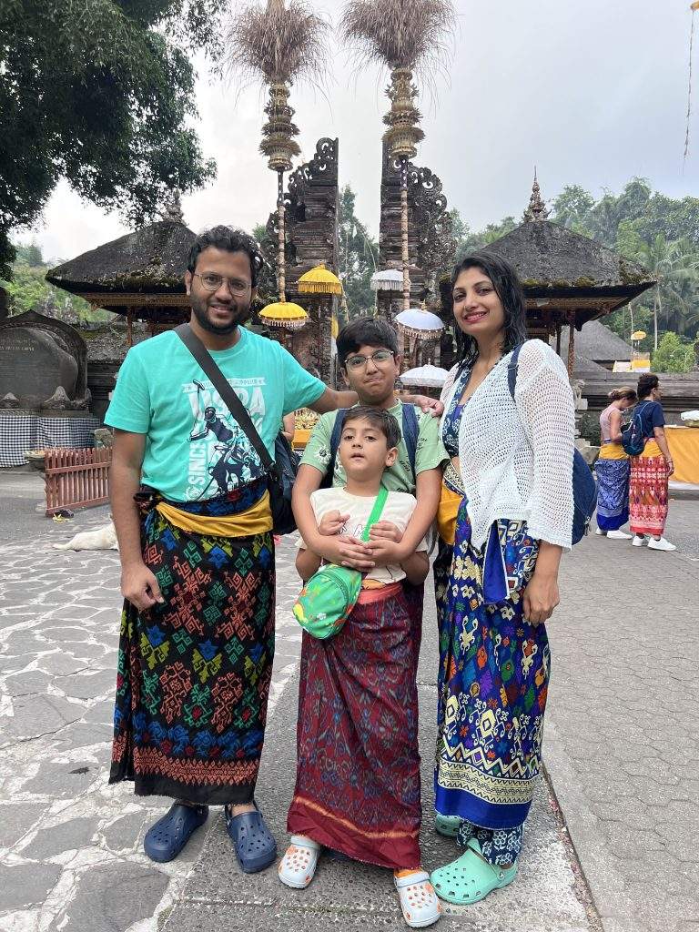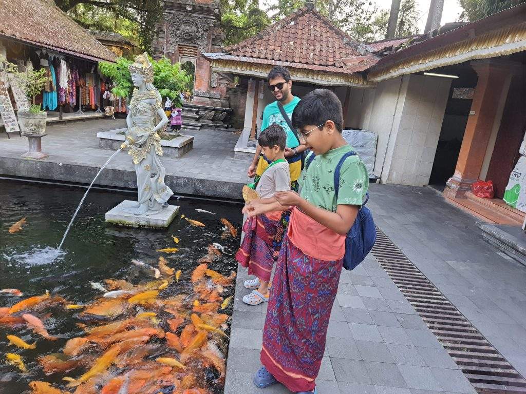 When in Bali, a temple visit is much to know about its spiritual side. Amongst lots of them, we chose the famous Tirth Imphul Temple, a place that felt peaceful and spiritual. Before entering the temple, we need to wear something called a Balinese sarong. The sarong is a colourful cloth that is important in Bali, worn like a lungi—it’s a way of showing respect.
