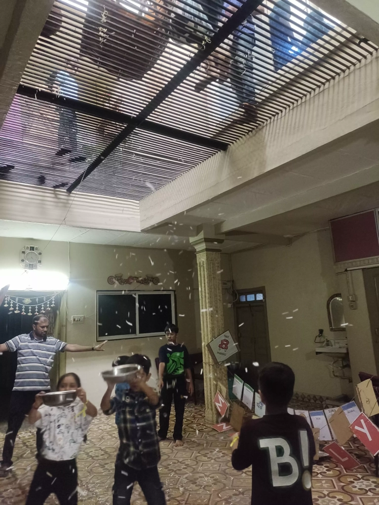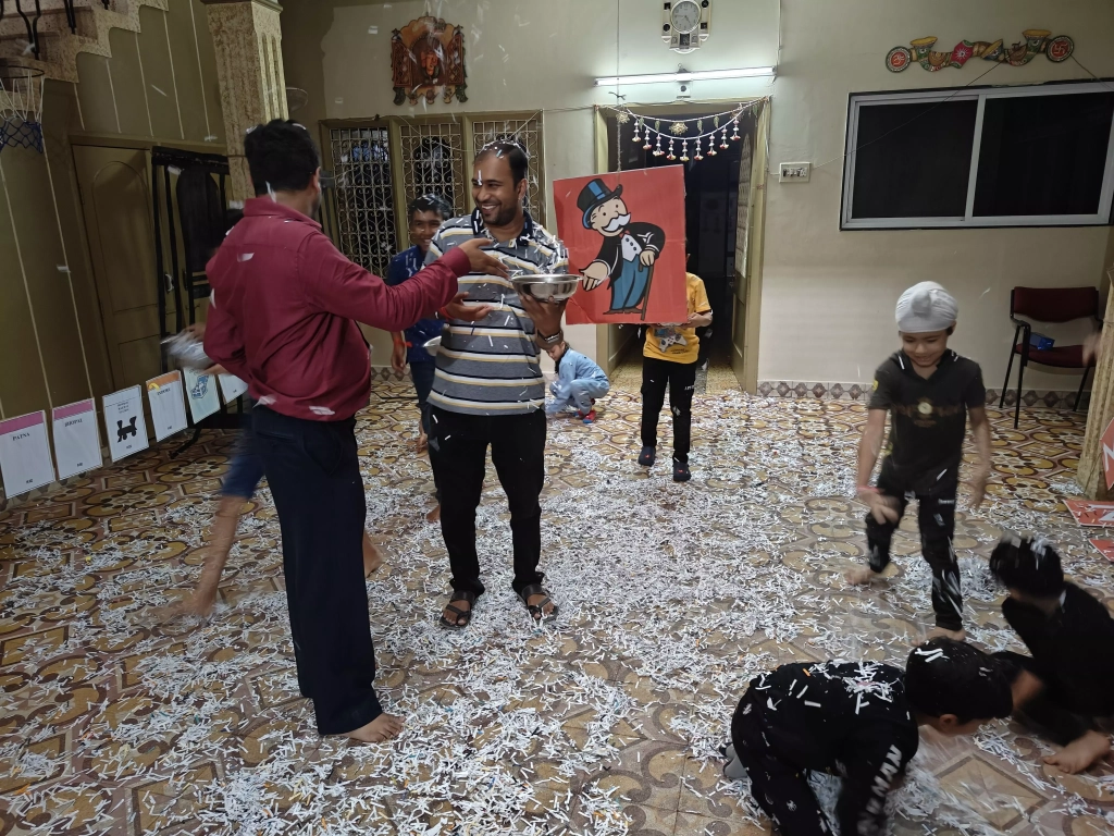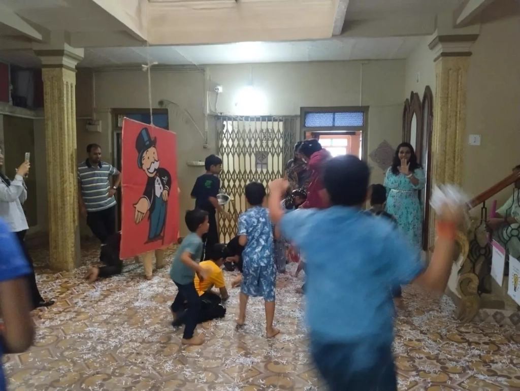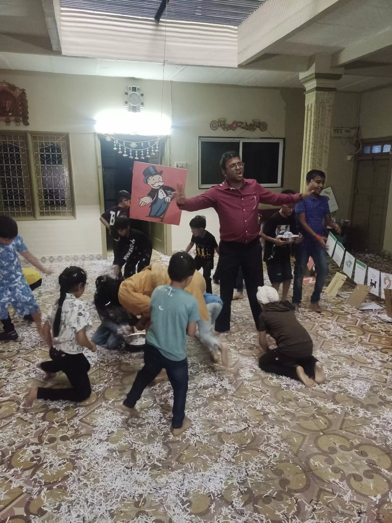 Aside from the live Monopoly game, another highlight was the “Catch the Raindrops” game. We sprinkled shredded paper from the jaali in our chowk, and the kids had to catch the pieces in bowls. The group that collected the most paper won, creating a scene of raining Monopoly money. The children also enjoyed our traditional “Khachra fight” game, which involves playful paper stripe fights, adding to the ultimate fun.