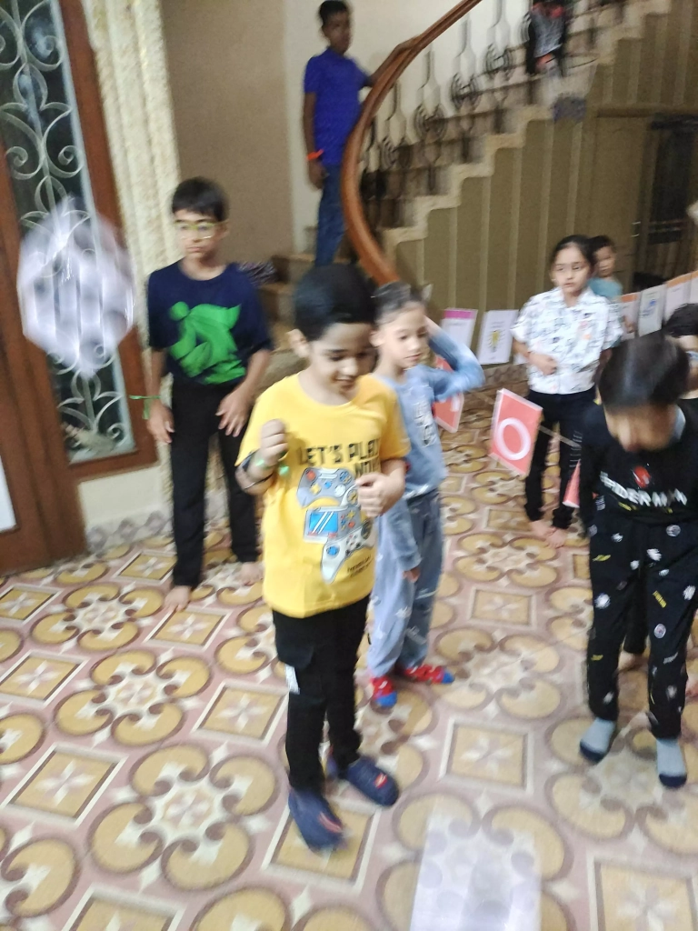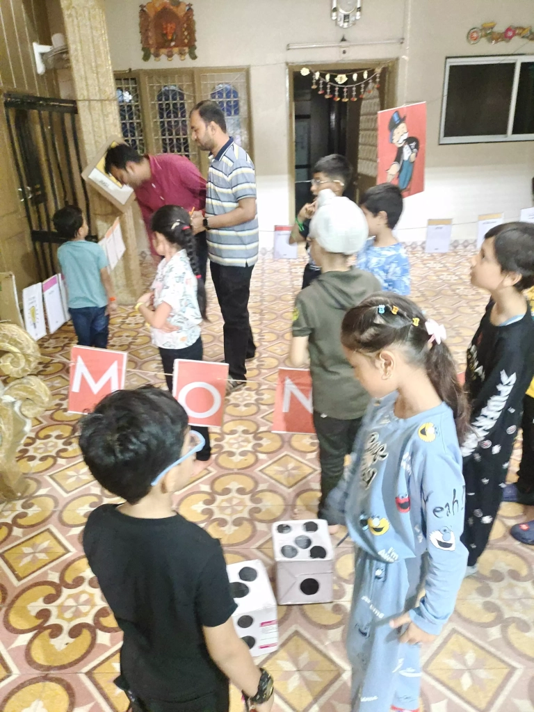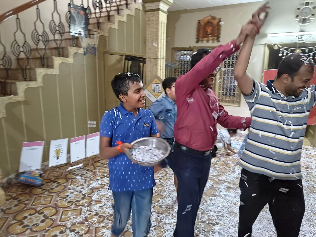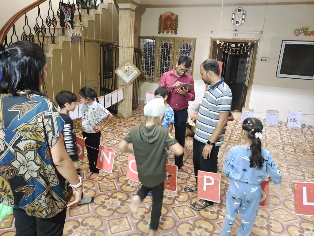 Aside from the live Monopoly game, another highlight was the “Catch the Raindrops” game. We sprinkled shredded paper from the jaali in our chowk, and the kids had to catch the pieces in bowls. The group that collected the most paper won, creating a scene of raining Monopoly money. The children also enjoyed our traditional “Khachra fight” game, which involves playful paper stripe fights, adding to the ultimate fun.
