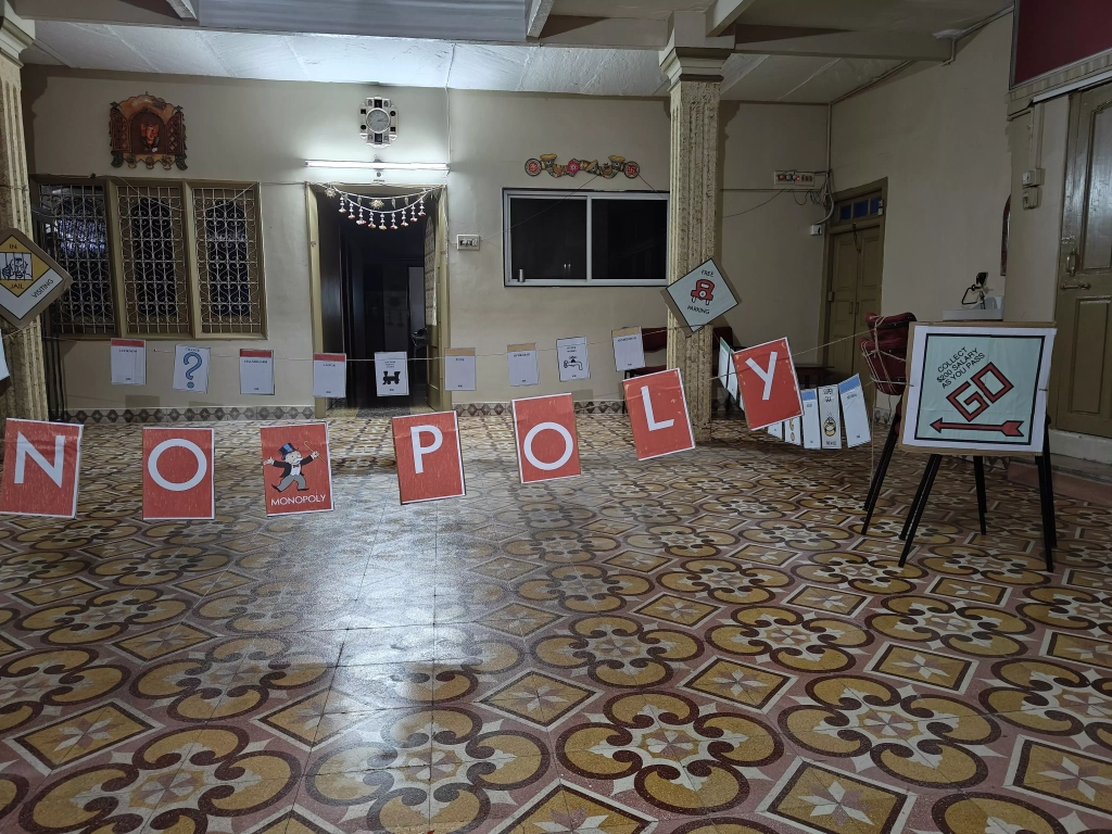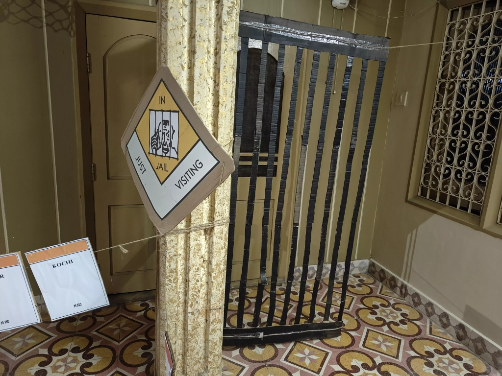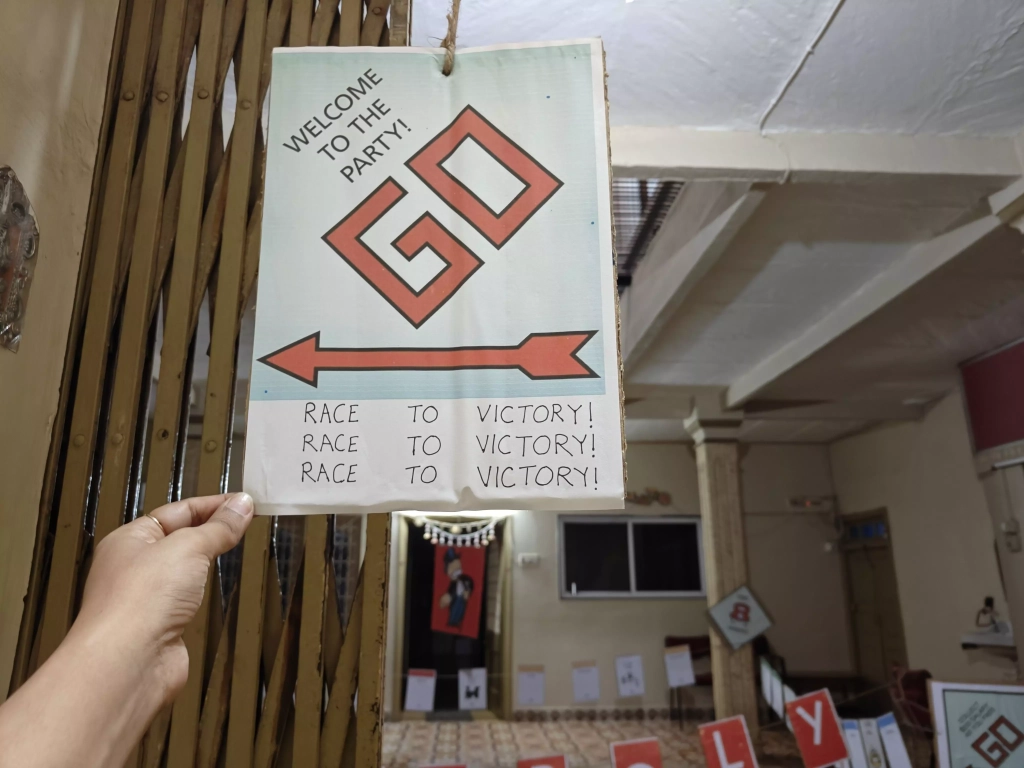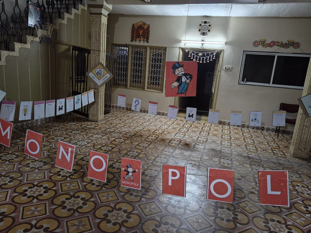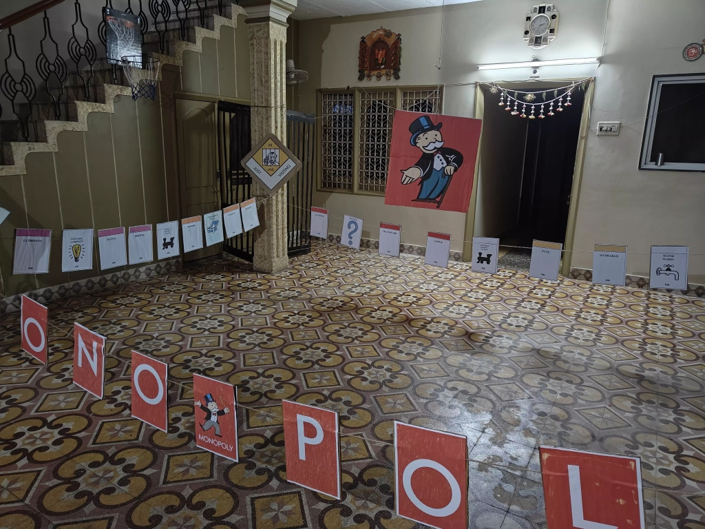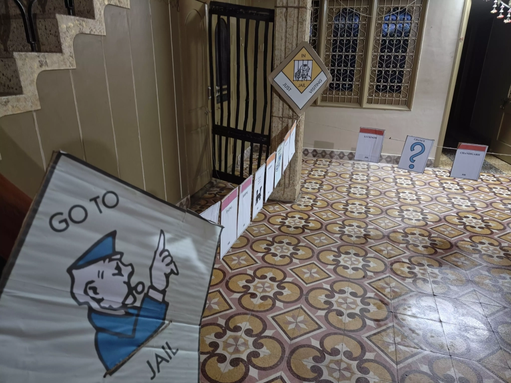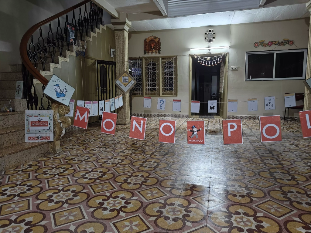 Viraj plays the Indian version of Monopoly, so I designed Indian city tickets for the game, printed them on cardboard, and hung them in a square format around our chowk, attaching them to four poles. We also created a cardboard jail, which added an authentic touch to the venue. The oversized dice, made from gift boxes, were a hit. To save paper, Shantanu, Viraj’s dad, coded a digital system to manage money counting, Community Chest, and Chance cards. A large Monopoly Man poster overlooked the gaming area, making it feel like the real Monopoly Man was monitoring the game.